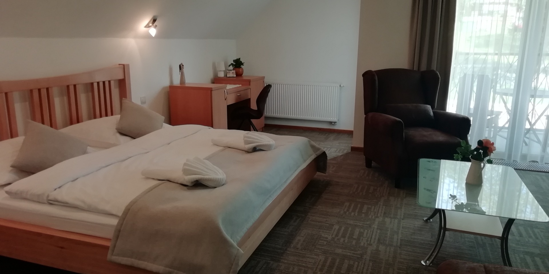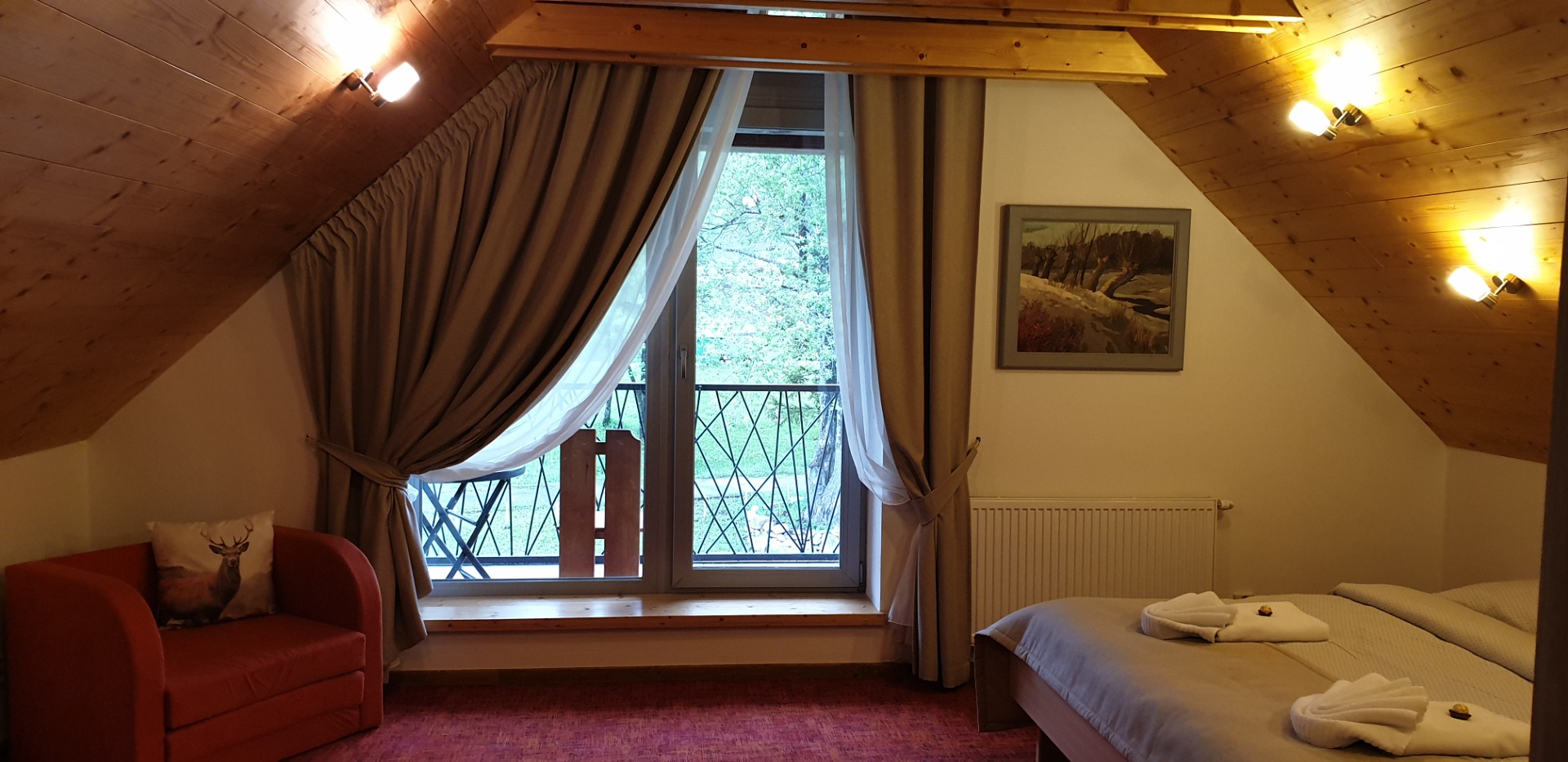 Romantická izba v podkroví s krásnym výhľadom, vlastnou kúpeľnou s WC Kapacita 2+1 osôb. Počet izieb 1x s balónom a 1x s terasou.